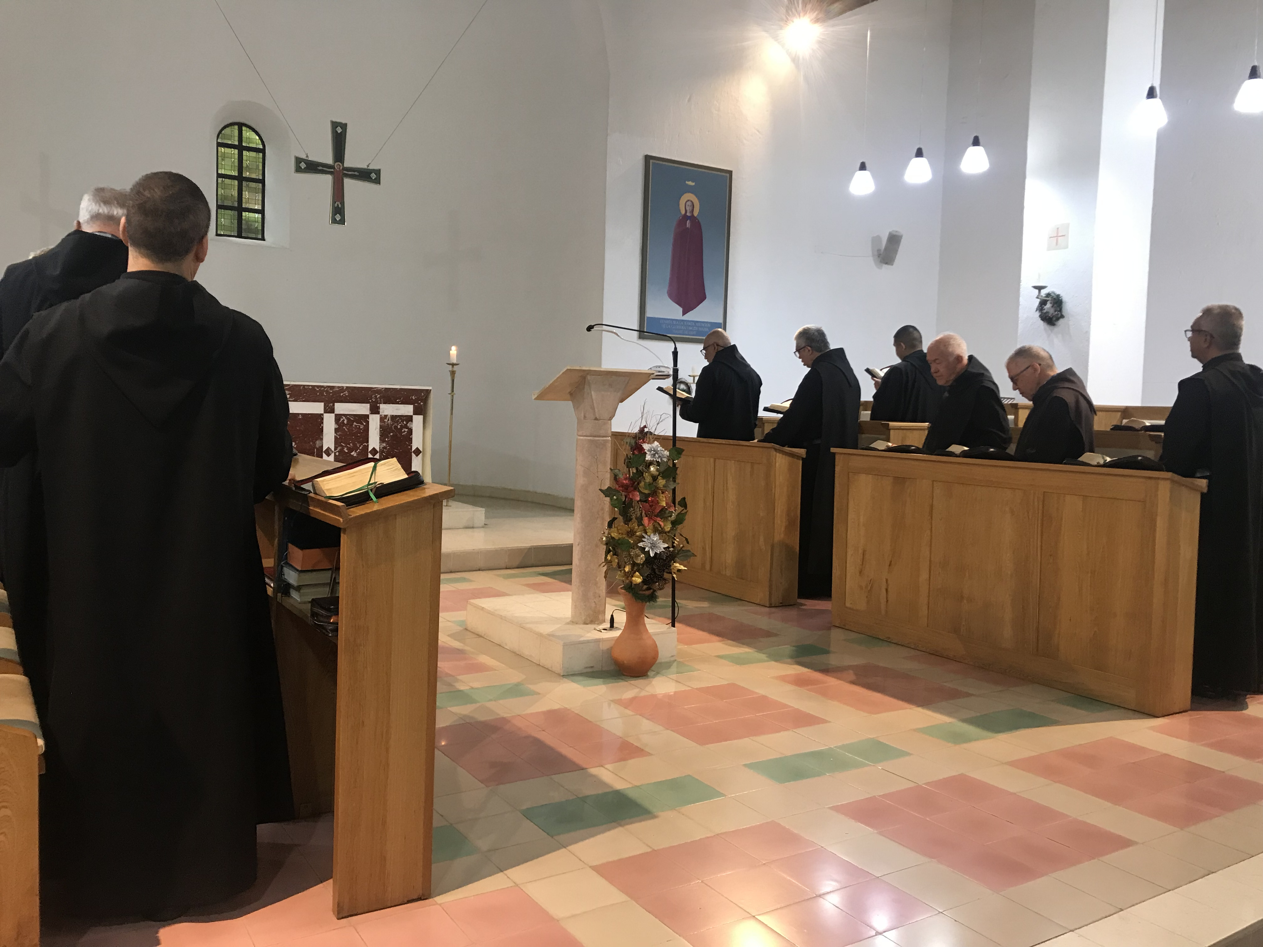 Si tal es el objetivo, es comprensible que San Benito señale la solicitud para la oración como medio privilegiado para alcanzarlo. En la vida de la comunidad monástica ocupa un lugar prioritario la celebración litúrgica de las horas (llamada en la Regla de S. Benito “la obra de Dios”); desde la madrugada hasta el anochecer los monjes nos reunimos a distintas horas en el coro para cantar la alabanza divina, para orar por la Iglesia y por los hombres del mundo entero, para dar gracias al Señor por su misericordia. La acción de gracias, en comunión con la Iglesia universal, alcanza su punto culminante en la celebración de la Eucaristía, centro de la jornada monástica.